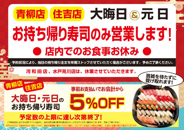 【青柳店・住吉店】大晦日、元日の「お持ち帰り寿司」ご予約承り中!